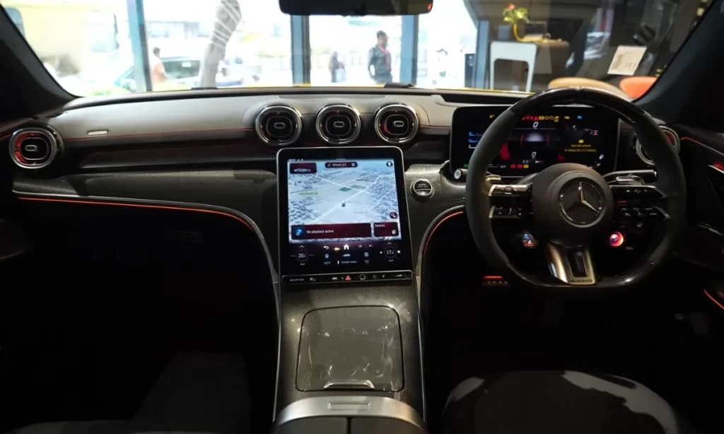 Mercedes-Benz केबिन में आपको 12.3-इंच डिजिटल इंस्ट्रूमेंट क्लस्टर और 11.9-इंच पोर्ट्रेट-स्टाइल सेंट्रल टचस्क्रीन मिलता है, जो लेटेस्ट MBUX इंफोटेनमेंट सिस्टम से लैस है। इसमें AMG-स्पेसिफिक डिस्प्ले जैसे “Supersport” लेआउट भी दिए गए हैं, जो परफॉर्मेंस डेटा को खास अंदाज़ में दिखाते हैं।